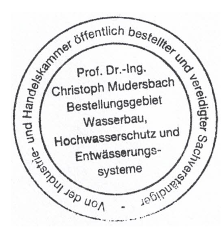 Prof. Mudersbach ist von der Industrie- und Handelskammer (IHK) Siegen als Sachverständiger für Wasserbau, Hochwasserschutz und Entwässerungssysteme seit 2013 öffentlich bestellt und vereidigt. Die Tätigkeiten sind dabei nicht auf das Gebiet der IHK Siegen begrenzt, sondern können bundesweit ausgeübt werden. Hier gelangen Sie zu dem bundesweiten Sachverständigenverzeichnis der IHK.
