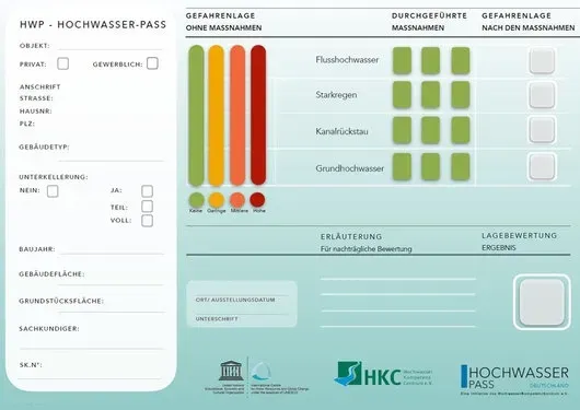 Der Hochwasser-Pass bietet eine fundierte Risikoeinschätzung für Ihr Haus. Auf Grundlage einer Standortanalyse und Gebäudebewertung erhalten Sie Maßnahmenempfehlungen, mit denen eine Gefährdung durch Starkregen und Hochwasser reduziert werden kann. Der Hochwasser-Pass ist für bestehende oder geplante Privat- und Gewerbe-Immobilien und dient als Nachweis darüber, wie hochwassergefährdet, -gesichert oder -angepasst Ihr Haus ist. Dies liefert u.a. Versicherungen eine objektive Basis für die Bewertung von Elementarschadenspolicen. Weitere Informationen zum Hochwasser-Pass finden Sie hier.